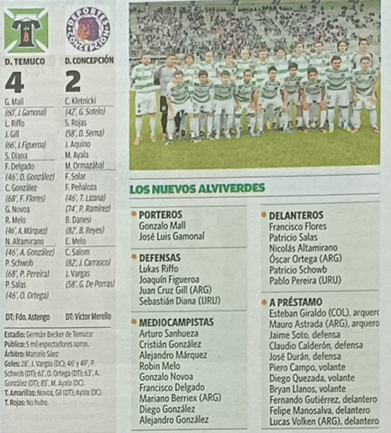 Temuco formó con:Di Gregorio; Reyes ,Galleguillos, Vera y Bessala; Rolon, Pizarro; Figueroa, Troncoso; Ibañez y Neira.