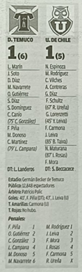 Formación de Deportes Temuco: León; Suazo, Toro, Yáñez, Parra; Barría (Zúñiga), Díaz, González, Aguilar (gol 44’), Guzmán y Álvarez
