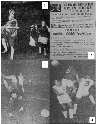 1) El “Indio Pije” y una mujer mapuche ingresan a la cancha 2) Aviso del Club en el Diario Austral sobre el valor de las entradas, puntos de venta, horario de ingreso y apertura del estadio para el día del partido. 3) Volada plástica de Francisco Fernández, uno de los puntos altos en el encuentro frente a la URSS. 4) Banishevskiy elevándose y ganándole en el salto a Body y Antezana. Fuente: El Diario Austral de Temuco. Jueves 03 de marzo de 1966.